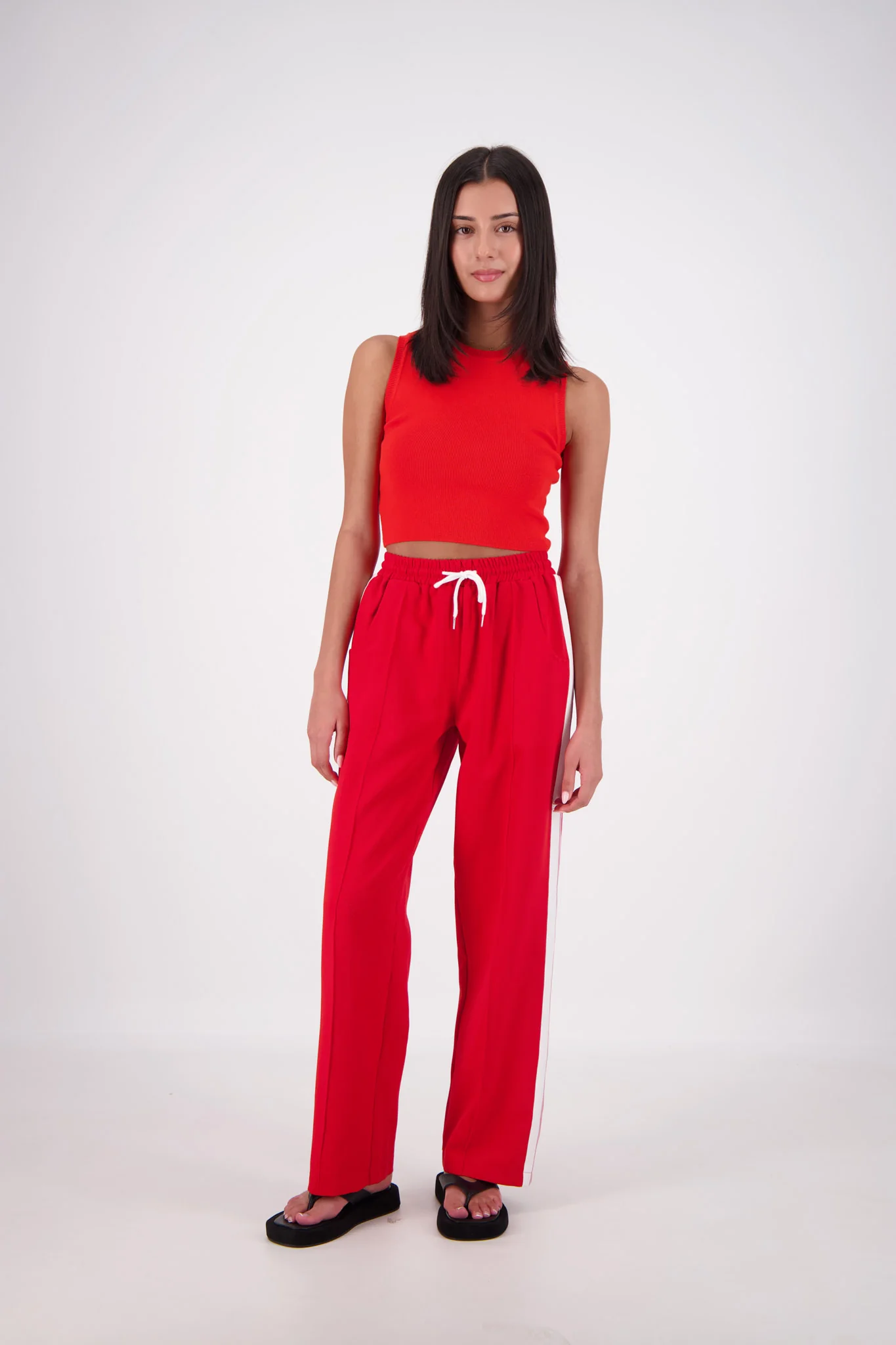 Transform your wardrobe with our Cassis Trouser Red. Made from mid-weight tailoring fabric, these trousers offer a comfortable and elegant silhouette that can effortlessly transition from day to night. The contrast side stripe in white and pink adds a touch of sophistication, while the elastic waistband with white drawstring ensures a perfect fit. Front leg pintucks create a flattering look, and these trousers are designed for easy care, making them a versatile and stylish addition to any outfit!
