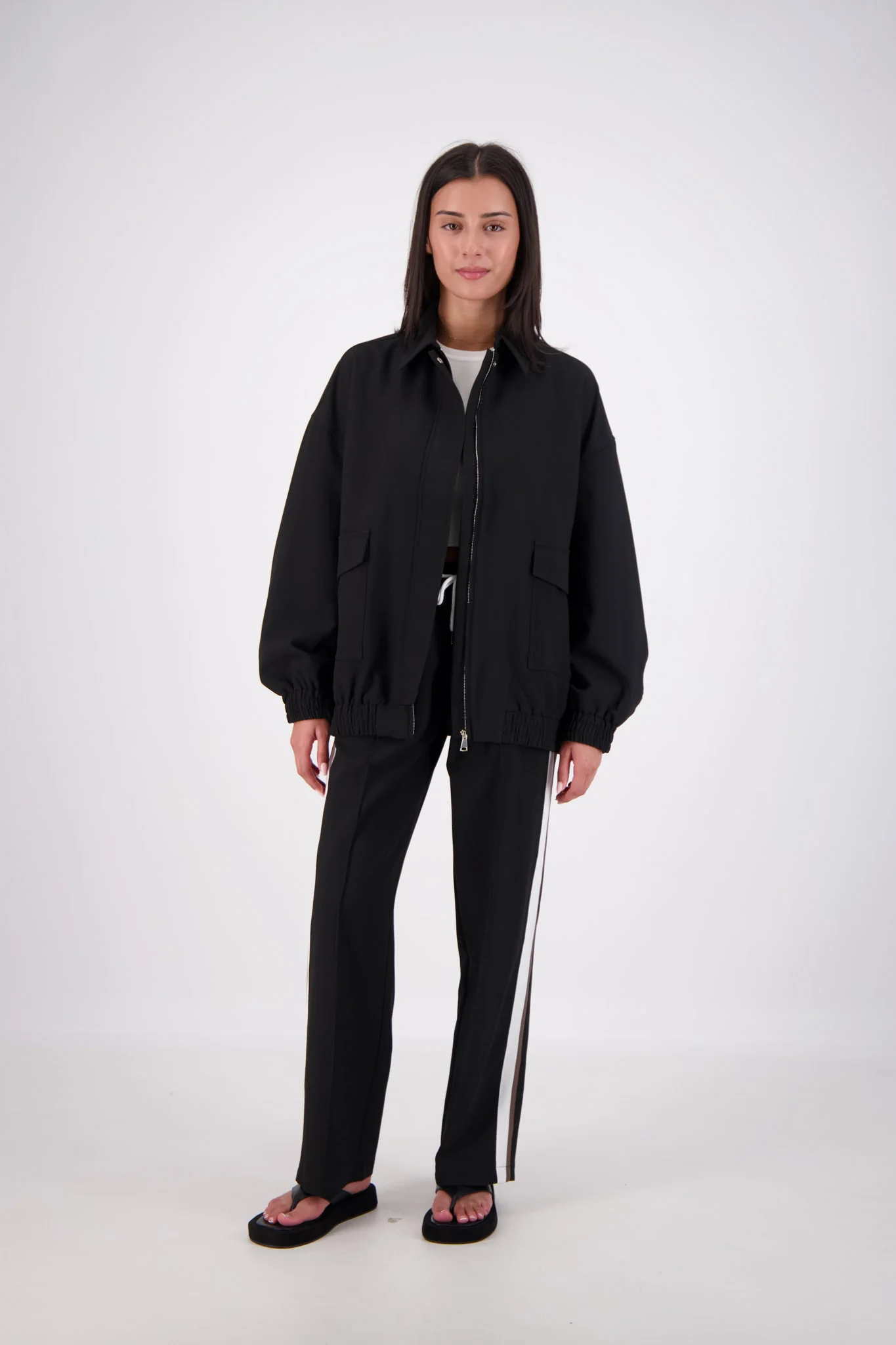Elevate your style with our Ischia Bomber Jacket in classic black. Oversized and relaxed silhouette paired with mid-weight tailoring fabric, fully lined for comfort. Front metal zip and press stud closures, 2 patch pockets & 2 hidden pockets for added convenience. Elastic hem and cuffs for a perfect fit. Pair with the Cassis Trousers for a complete look.
