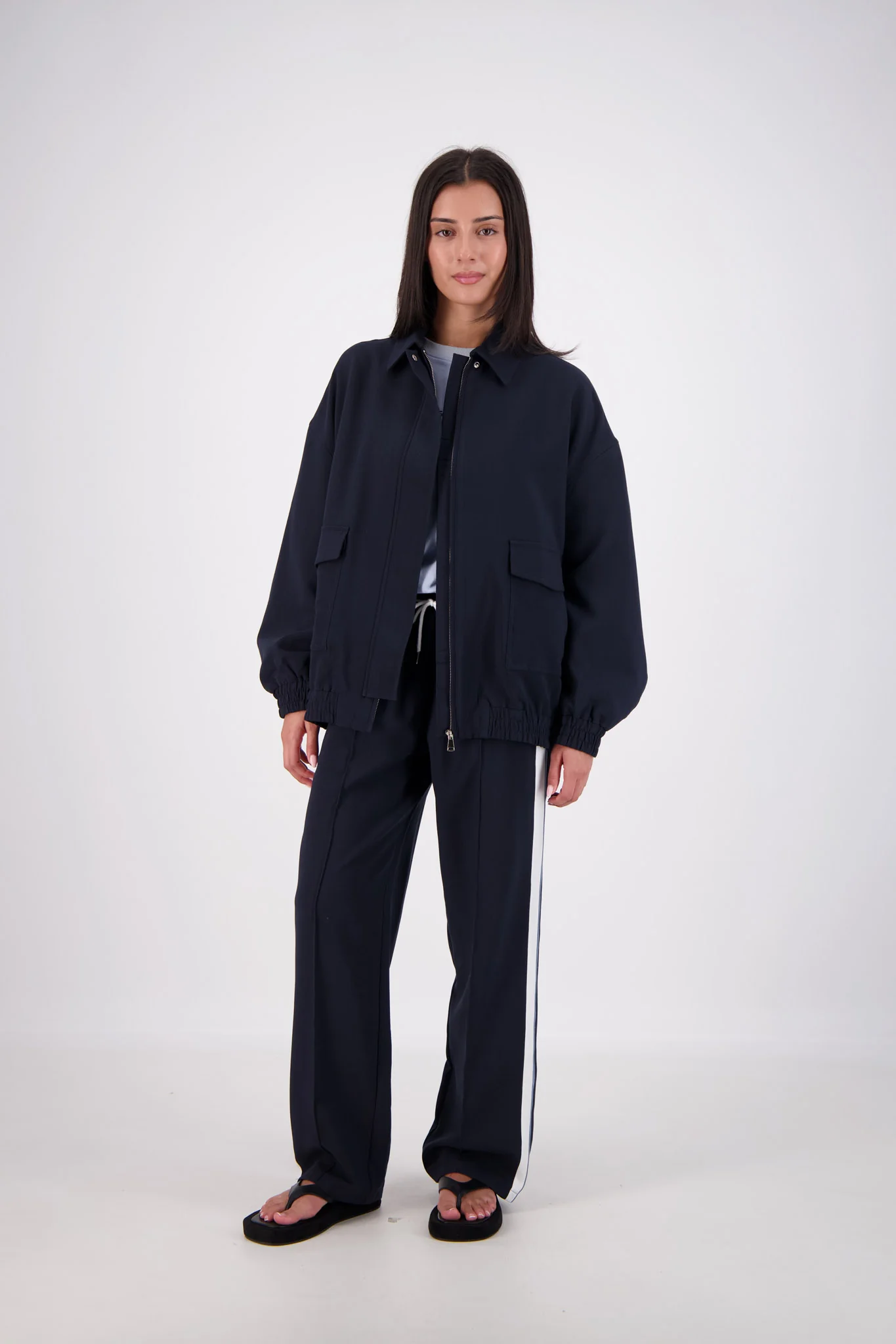 Elevate your style with our Ischia Bomber Jacket in classic Navy. Oversized and relaxed silhouette paired with mid-weight tailoring fabric, fully lined for comfort. Front metal zip and press stud closures, 2 patch pockets & 2 hidden pockets for added convenience. Elastic hem and cuffs for a perfect fit. Pair with the Cassis Trousers for a complete look.
