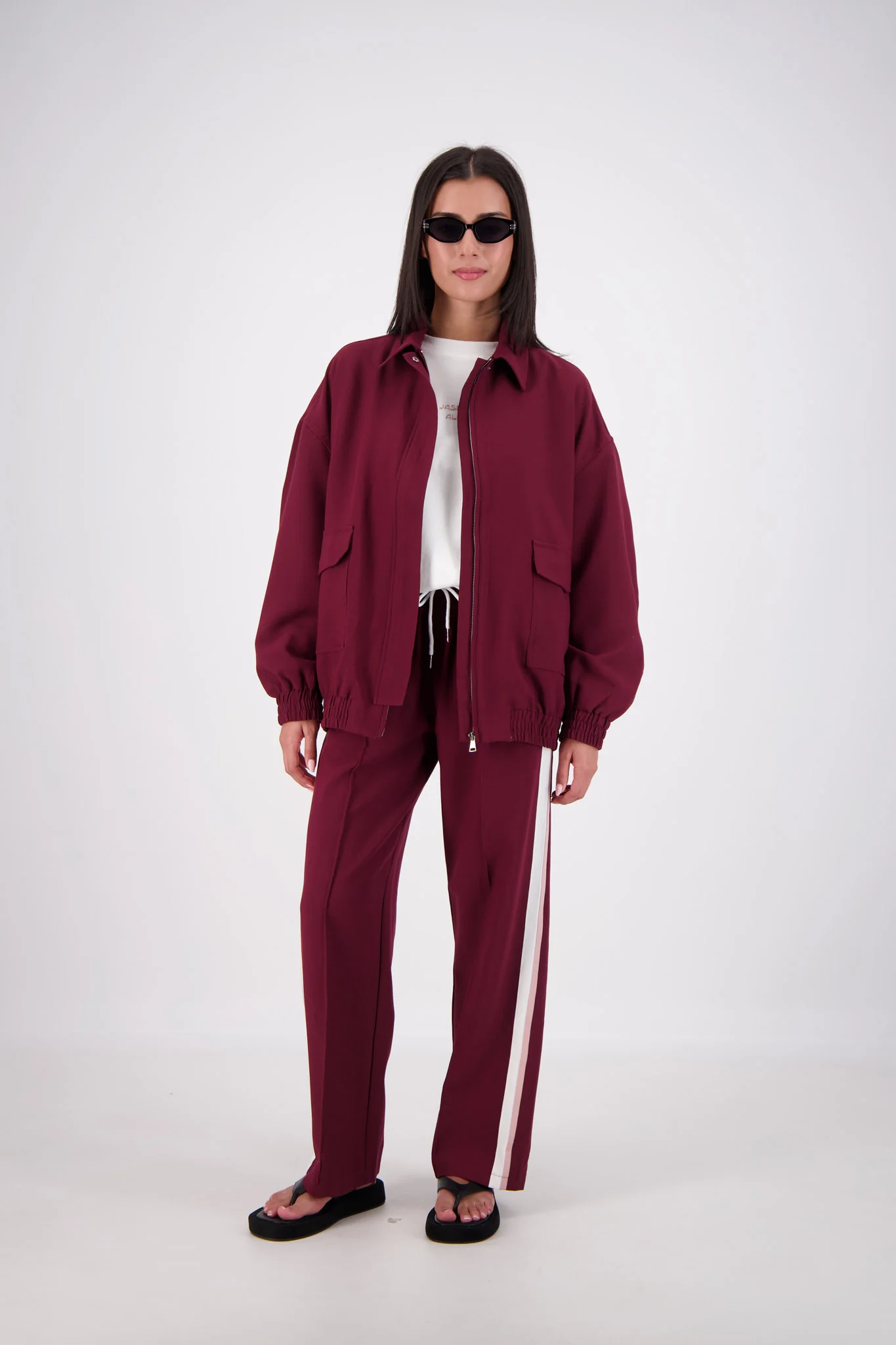 Elevate your style with our Ischia Bomber Jacket in rich plum. Oversized and relaxed silhouette paired with mid-weight tailoring fabric, fully lined for comfort. Front metal zip and press stud closures, 2 patch pockets & 2 hidden pockets for added convenience. Elastic hem and cuffs for a perfect fit. Pair with the Cassis Trousers for a complete look.