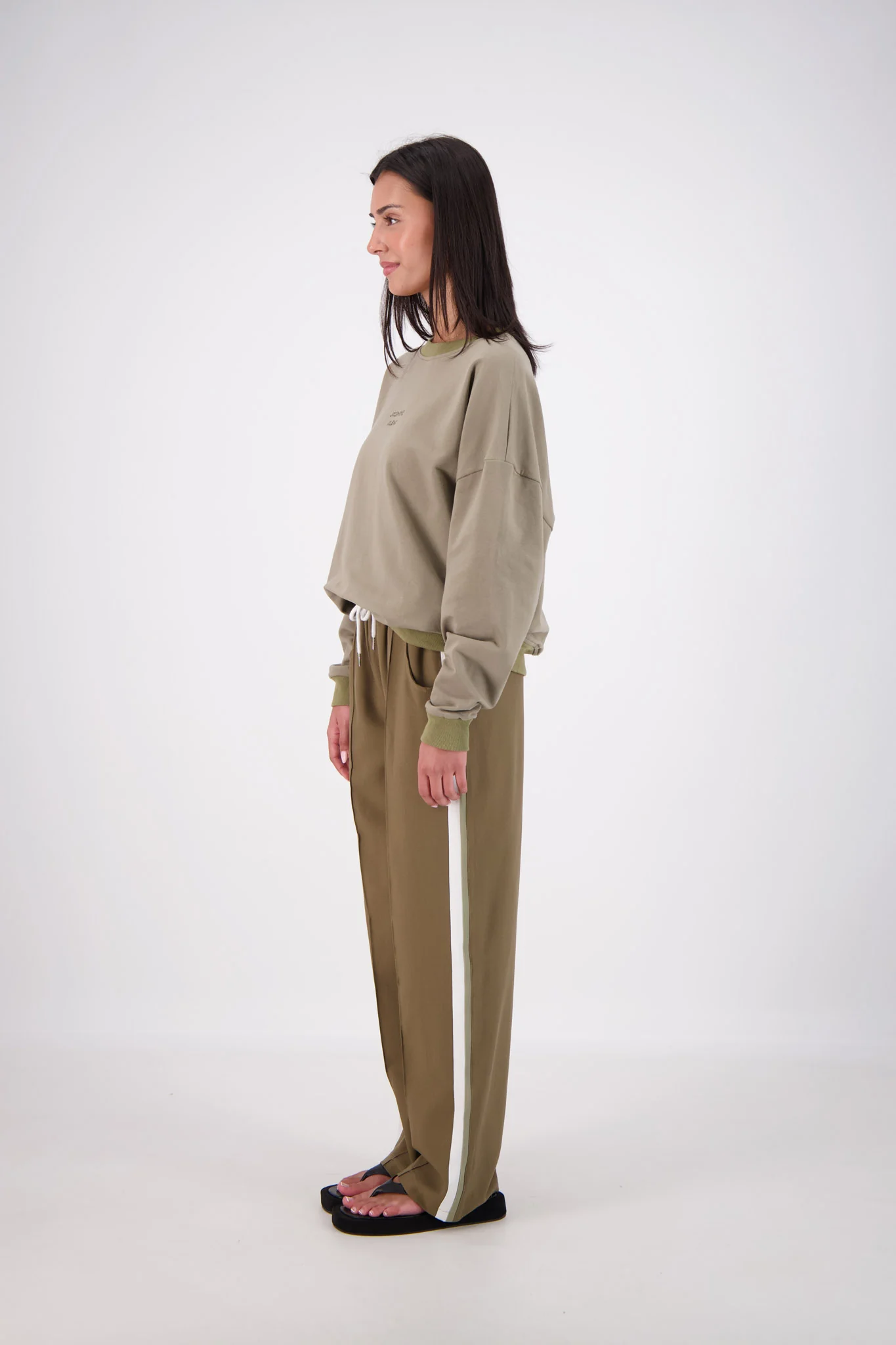 This cozy sweatshirt features a relaxed silhouette and drop shoulder seams for a comfortable, laid-back look. The ribbed cuffs and hem add subtle texture, while the eye-catching screen-printed logo in dark olive adds a pop of colour. Perfect for lounging or running errands with style and ease.